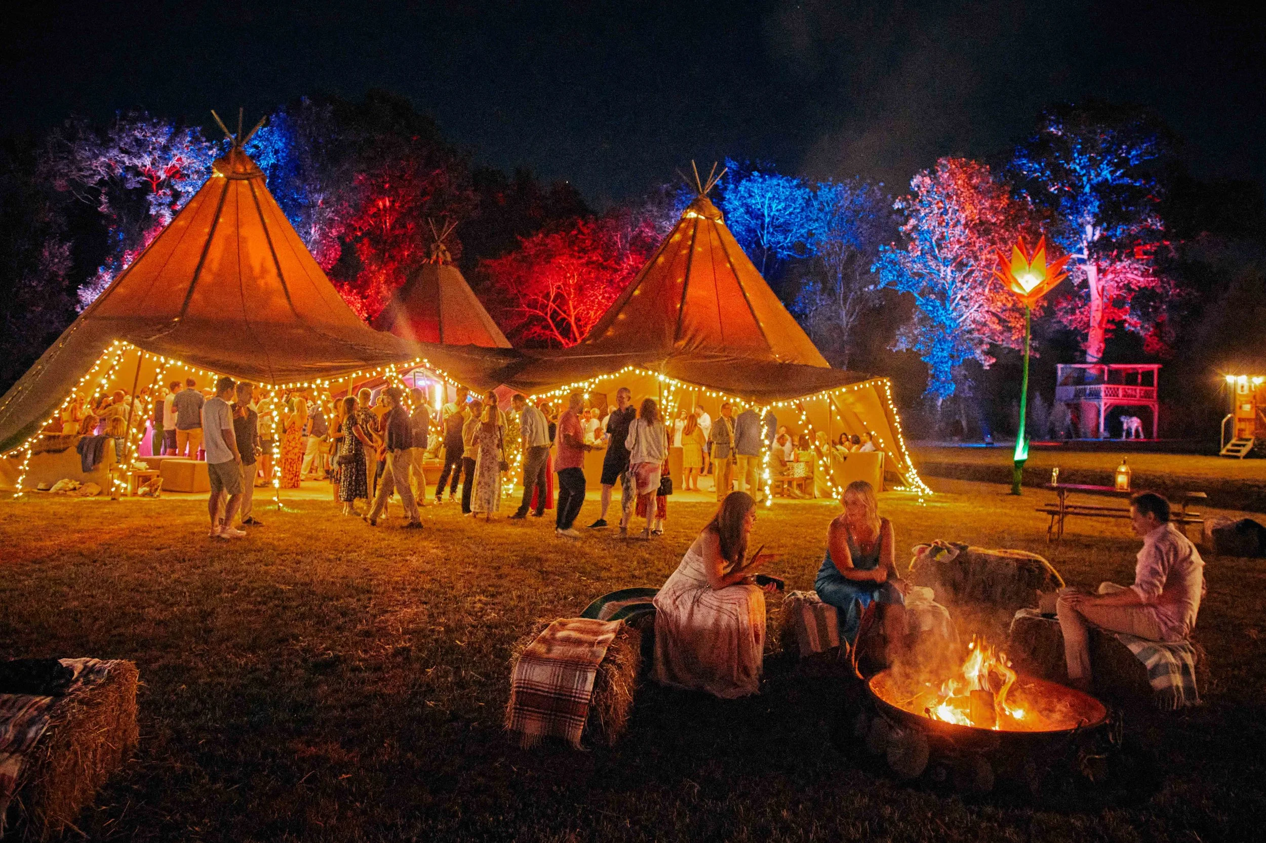 • Fairy lights, uplighters and a chandelier for atmosphere inside the tipis
